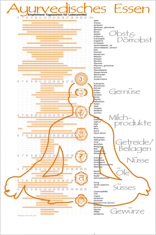 Infografik für empfohlene Tageszeiten, zu denen nach ayurvedischen Empfehlungen bestimmte Lebensmittel verzehrt werden sollten.